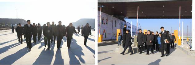 在保稅物流中心卡口上方"青海曹家堡保稅物流中心"以中英文兩種字體呈現(xiàn),海關標識赫然醒目。王黎明副省長一行在實地查看了1#、2#保稅倉庫、卡口、查驗庫、辦事大廳等設施,并邊走邊聽取物產(chǎn)集團總經(jīng)理王玉輝關于工程施工進展情況的匯報。