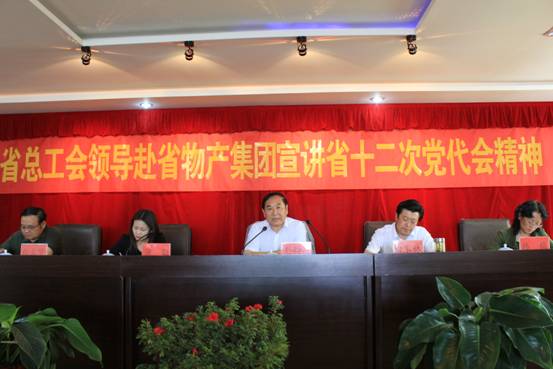 7月2日下午,省總工會巡視員、經(jīng)費(fèi)審查委員會主任劉西昆、經(jīng)審辦蒲勤主任、女工部韓梅部長、重工機(jī)械輕紡工會白立賢副主席一行4人來物產(chǎn)集團(tuán)宣講省十二次黨代會精神。集團(tuán)黨委書記、工會主席白家林同志主持宣講報告會,集團(tuán)兩級工會主席、委員40余人參加宣講報告會。